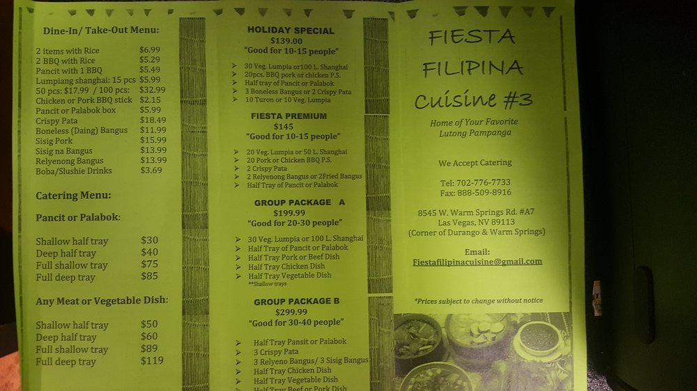 Fiesta Filipina Cuisine, located in Las Vegas, offers a delightful array of traditional Filipino dishes with a focus on seafood and barbecue. This Asian-owned gem provides a casual dining experience with options for delivery, takeout, and catering. The menu boasts favorites like Beef Nilaga, Pancit, Lechon Kawali, and Ginataan Bilo Bilo for dessert. Customers have praised the flavorful dishes and friendly service, making it a go-to spot for authentic Filipino cuisine. The restaurant's dedication to quality and consistency shines through in dishes like Beef Steak and Bangus, satisfying even the most discerning palate. With a cozy ambiance and attentive staff, Fiesta Filipina Cuisine is a must-visit for anyone craving delicious Filipino food in the area.